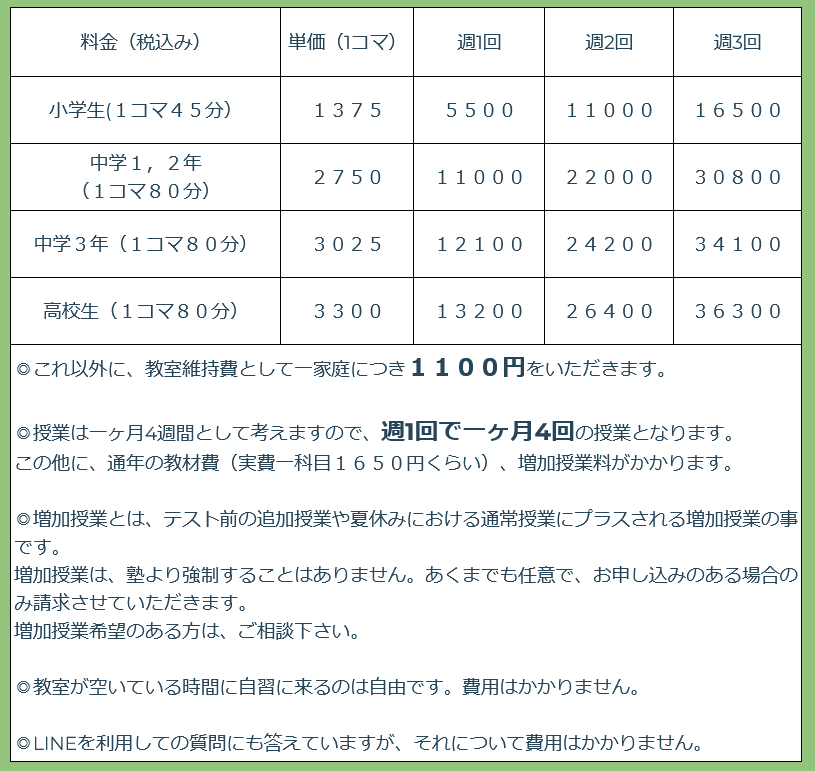 時々問い合わせがあります。 大人でも数学や算数を教えてもらえますか? 今までも、そのような問い合わせに指導できる範囲で受け入れてきました。 これからは、正式にコースとして設定しようと思います。 <大人の学び直しコース> こんな方に。。。 お子様の勉強を家で見てあげたい。質問されたときに答えてあげたい。 就職の時に算数ができる方が有利かもしれない。 仕事において、小中学校の時の算数・数学が分かっていなくて、自信を持って働けない。 何となく、今まで分かっていなかったことを分かるようになりたい。 指導できる科目 ・小学算数 (計算の基本から教科書応用レベルまで。中学受験内容はしません) ・中学数学 (基礎から公立高校受験レベルまで) ・中学英語 (基礎から公立高校受験レベル、高校2年生レベルまで。英会話はしません) それぞれの学習内容については、ご希望を確認して、必要なところだけを指導します。 <指導時間帯・費用> 平日午前中から午後3時までの80分(一回) 学習日時は入会時に相談させていただきます。 費用は週1回(月に4回)で12100円 週2回(月に8回)で23100円 |